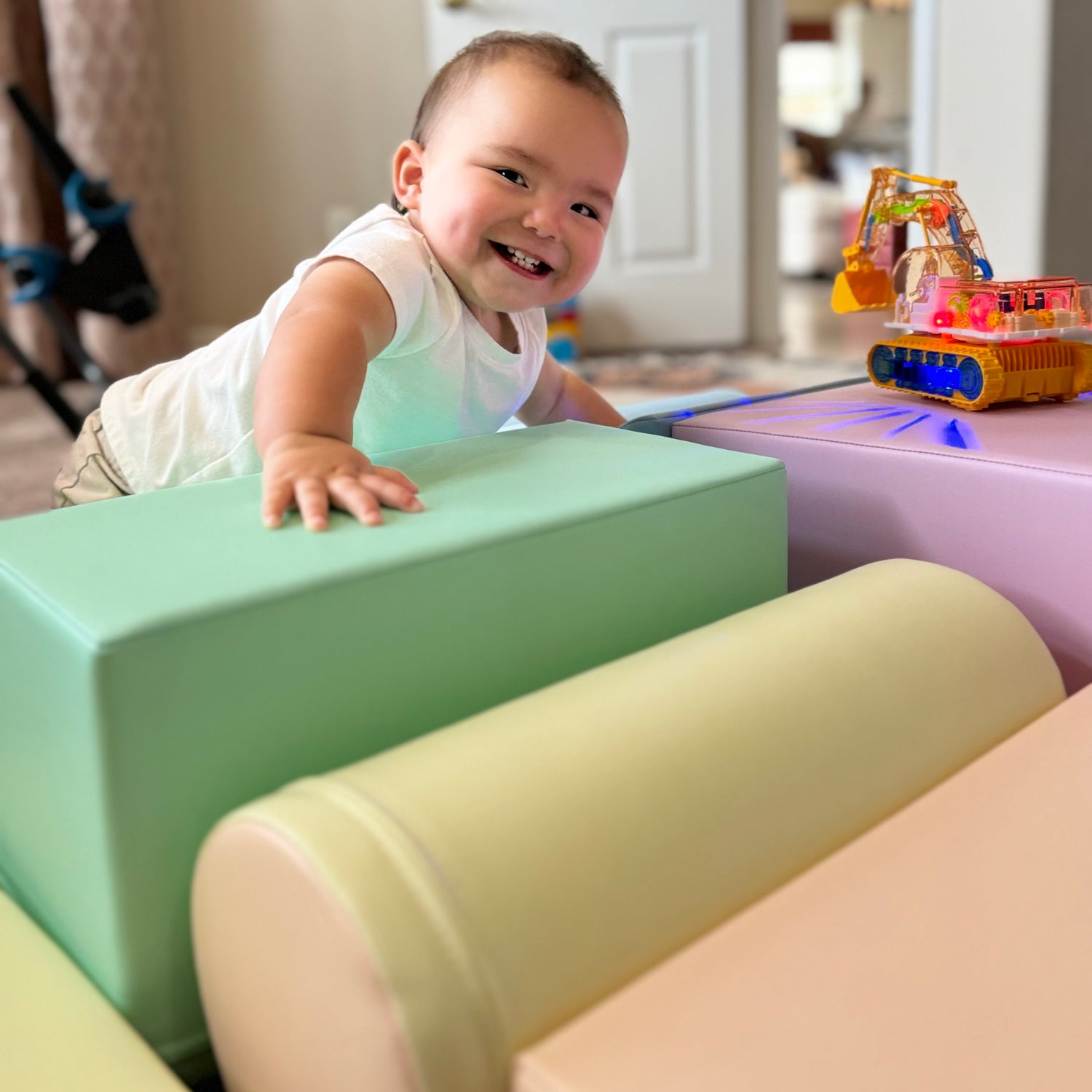 These blocks are firm enough for safe climbing, a great size, non skid bottoms, and the colours are beautiful. The possibilities are endless for arranging and we change it up every little bit! I think they’ll be well loved for years to come.
